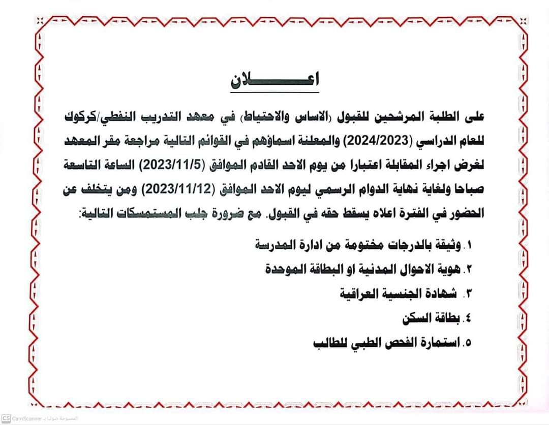 #عاجل || يسر معهد التدريب النفطي كركوك الاعلان عن اسماء الطلبة المقبولين والاحتياط للعام الدراسي ٢٠٢٣ / ٢٠٢٤